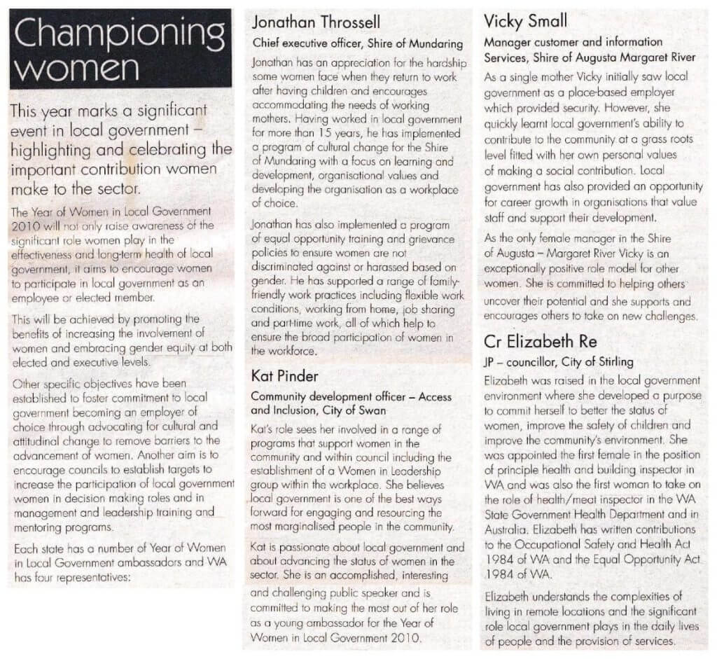 Article on “Championing women” from WALGA Advertising Feature “Local Government – Making your world work” published in The West Australian published Wednesday 4 August 2010 04/08/2010