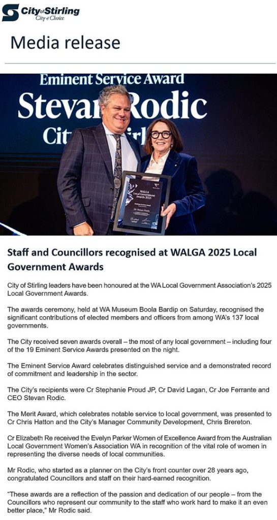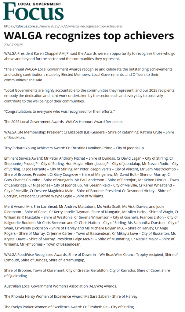 Evening on 19 July 2025 at WA Museum for WALGA Local Government Awards 2025 Celebrating Excellence in Local Government – ALGWA WA Award – City of Stirling Councillor Re – The Evelyn Parker Women of Excellence Award 23/07/2025